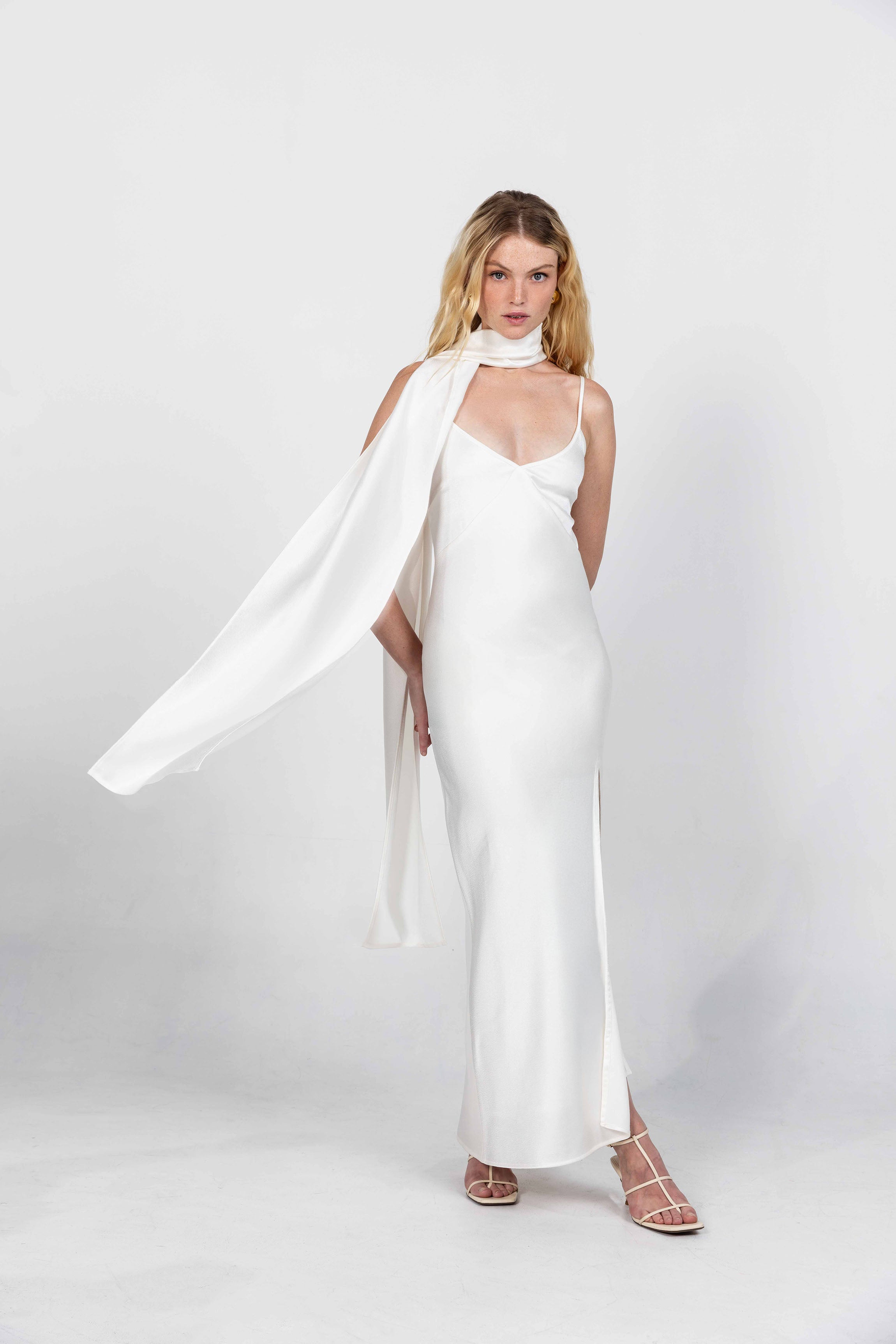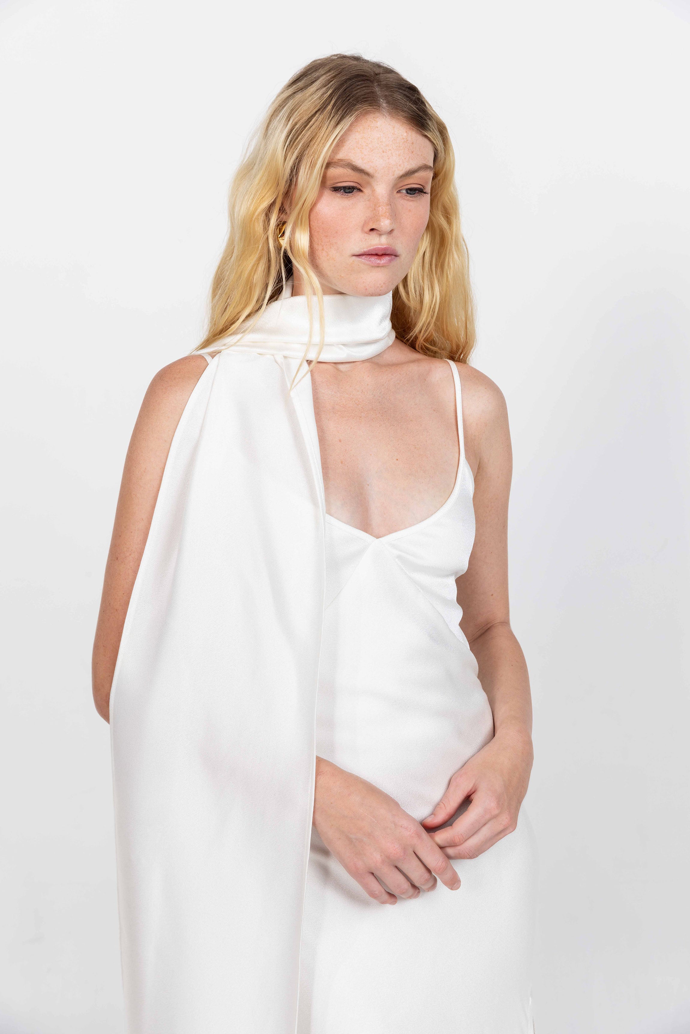 A beautifully considered styling piece designed to elevate your bridesmaid ensemble with graceful movement and effortless polish. The Finishing Touch Scarf drapes softly from the shoulders, creating a fluid line that elongates the silhouette and adds a touch of ceremony to any gown. Whether worn cascading down the back, wrapped around the arms, or draped over the shoulders, this accessory offers refined ways to personalise your bridal-party styling.