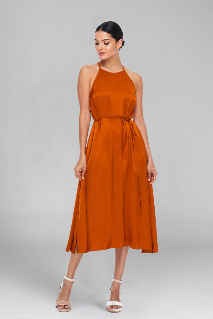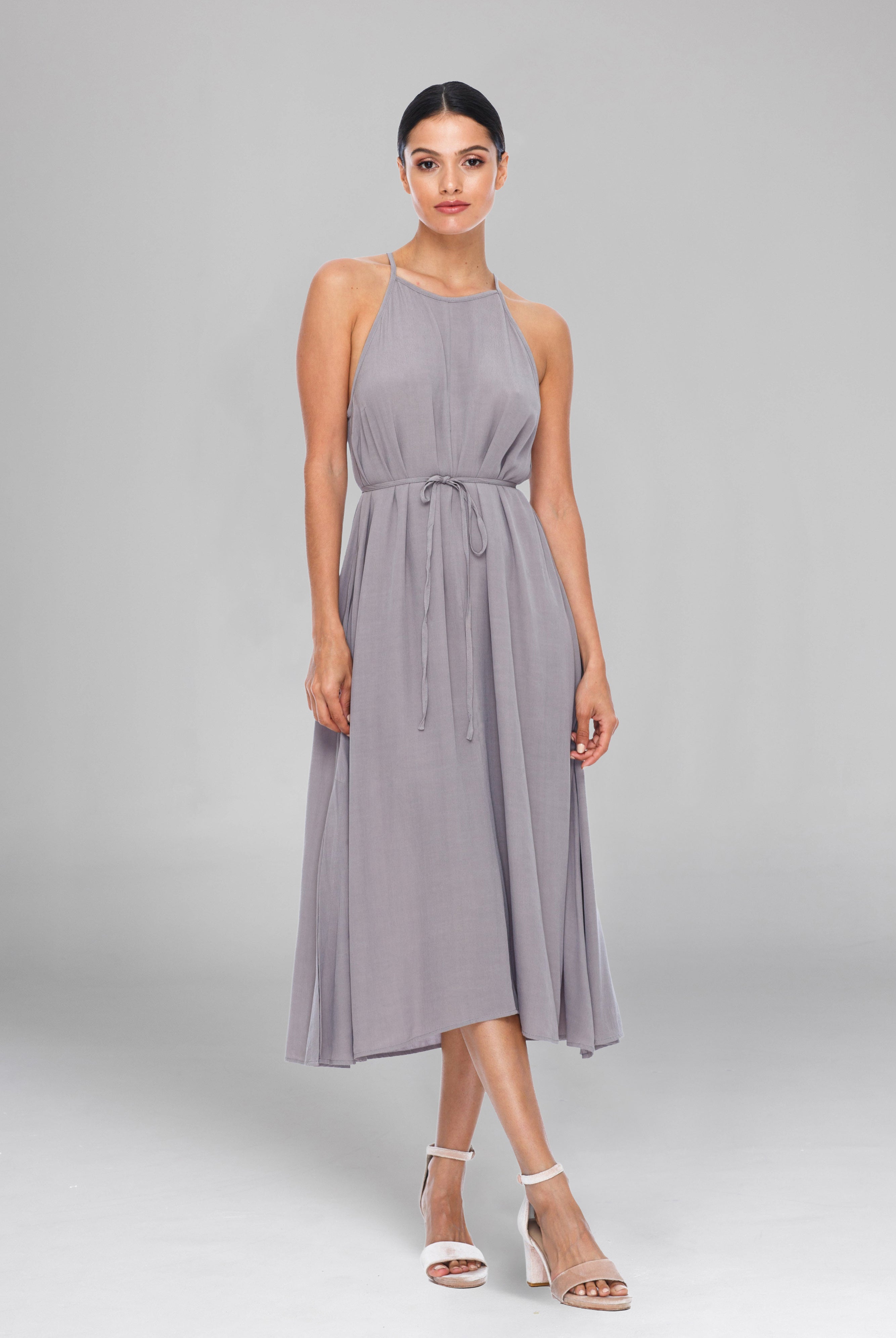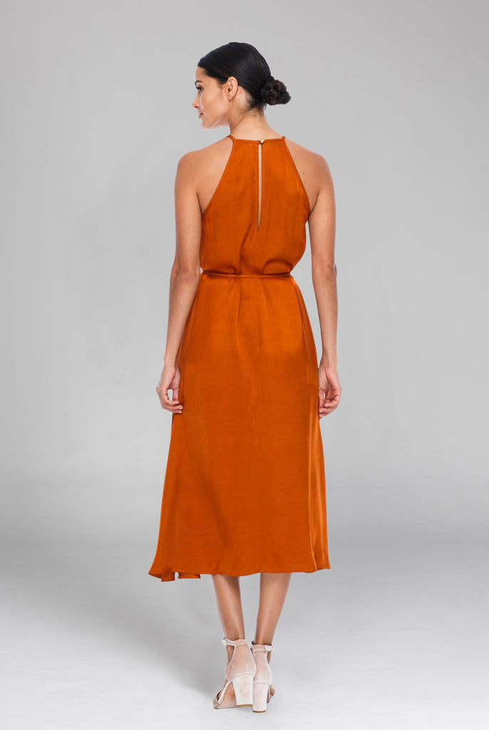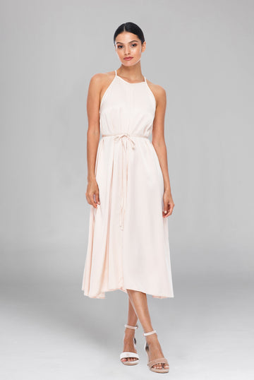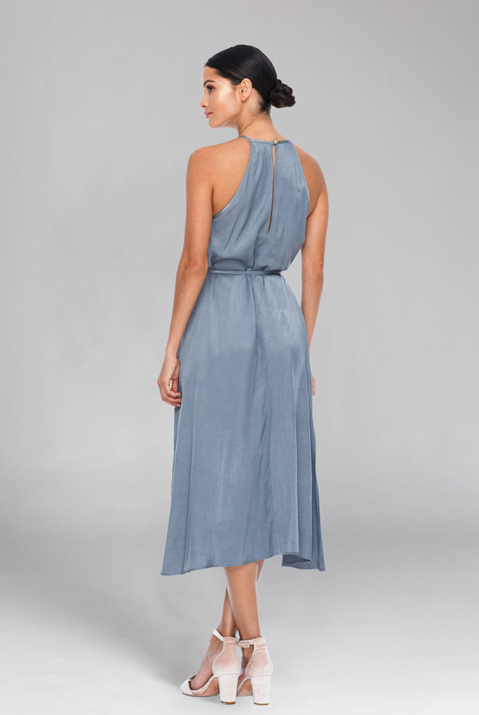 With a high halter style neckline, the Haven Dress has a classic look, elegantly baring the shoulders. The relaxed flowing skirt completes the flattering silhouette.