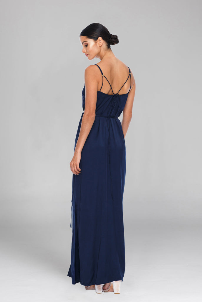 A classic wrap dress, the Ivy Dress has a slim-line cut for a more fitted shape; the dress also has side slits on both sides. The Ivy has a beautiful strap design across the back that is adjustable, and comes with delicate metal rings in either gold or silver.