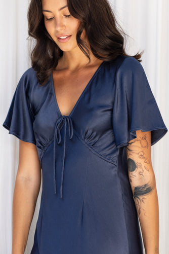 Fluttery sleeves and a deep v-neckline add charm to this bridesmaids dress! Gathers under the bust accentuate the A-line skirt, while drawcord detailing adds an elegant touch. It's the perfect midi length for any bridesmaids look.